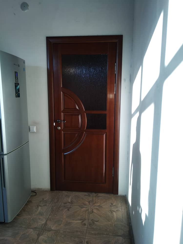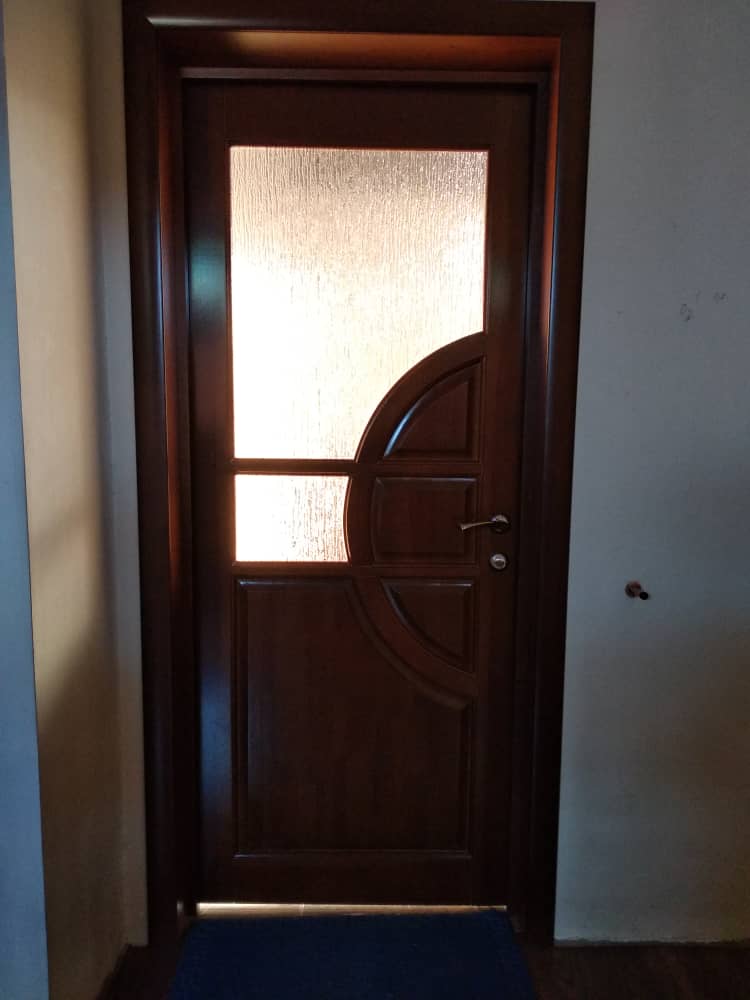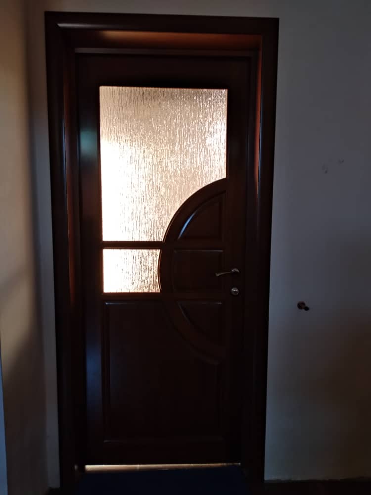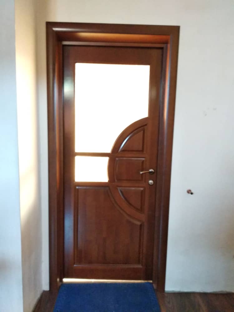 Дверь изготавливается из массива натурального дерева (сосна) и имеет стеклянные